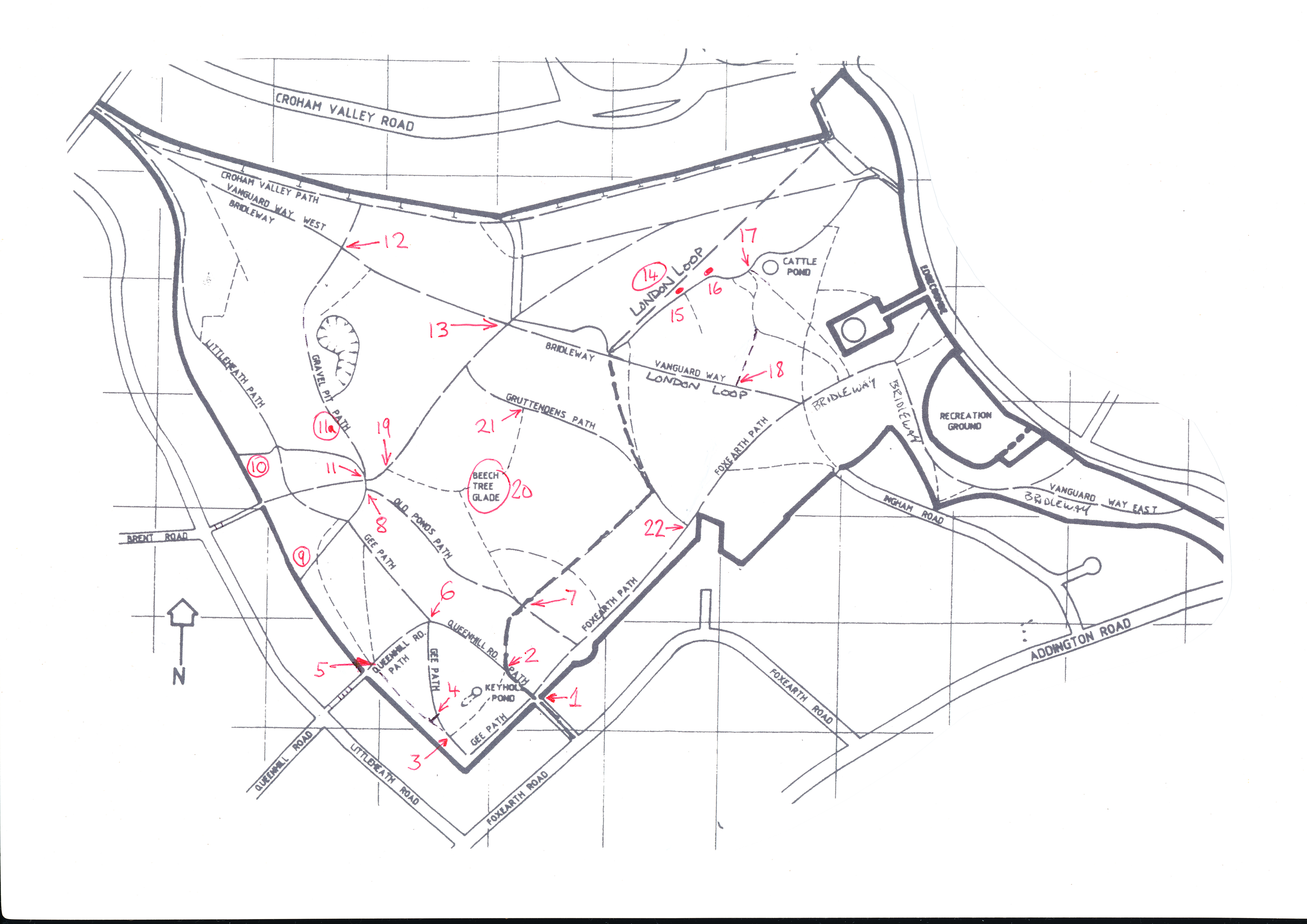 Continue along this path until you reach the Foxearth Rd entrance you came in by, Point 1, thus completing your circular route.